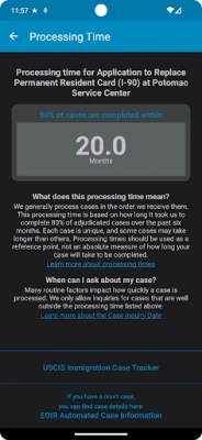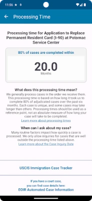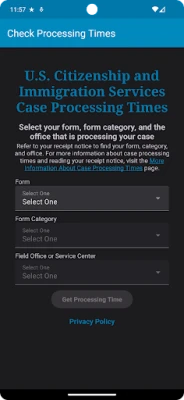 Tired of uncertainty? Say hello to confidence with the ability to check your Case Processing Time for USCIS with this app! Get the official USCIS data on case processing times right at your fingertips, available in both English and Spanish. Whether you're waiting for a visa, green card, or more, this app provides you with up-to-the-minute updates, ensuring you're always in sync with the latest processing trends.