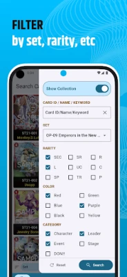 Easy and Convenient - Search, filter and sort cards the fastest way possible. Search cards by name, card ID, and sets. Filter by rarity, color, power, cost and others. Sort by price, power, counter, etc.