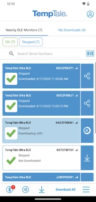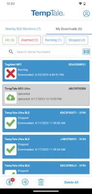 Once the app is installed on your smartphone, • Simply launch the app and the TempTale® BLE (Bluetooth) monitor will broadcast to the app (no pairing required). Click download arrow to download to your phone. Use the app for near field communication (NFC) to scan the TagAlert® NFC or TempTale® GEO Ultra by holding your smartphone and tapping the monitor—it will be read automatically.