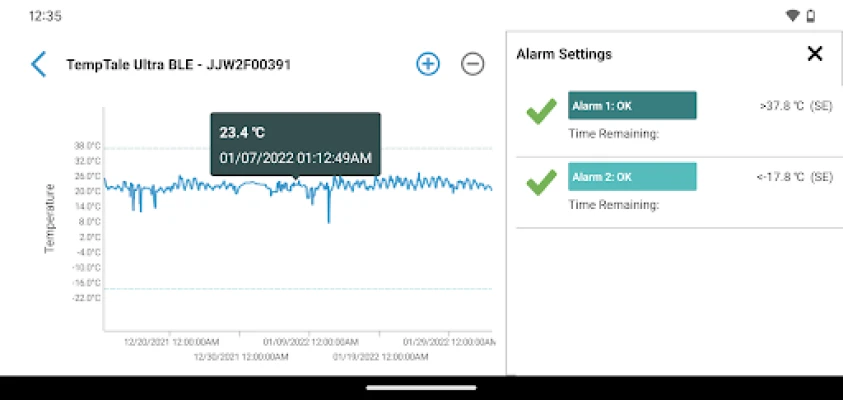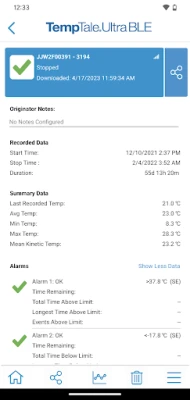 TempTale® GEO X, TempTale® BLE and TagAlert® NFC monitors can be programmed with up to six (6) temperature alarms and displayed in the app. TempTale® GEO Ultra alarms display in the software, login to ColdStream® Select / SensiWatch® Platform to check for shipment alarm status information.